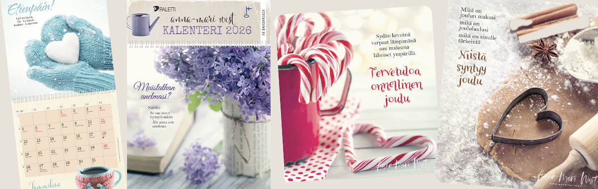 Joulun parhaat joululahjat eli 2026 seinäkalenterit ovat vielä myynnissä – kuten myös uudet joulukortit. Niistä olemassa erilaisia pakettitarjouksia, ne ovat kohdassa Tarjoukset. Korttiuutuudet löydät kohdasta Uutuudet. Ja yli 35€ tilaukselle saat ilmaiset postikulut. Iloisia shoppailuhetkiä!