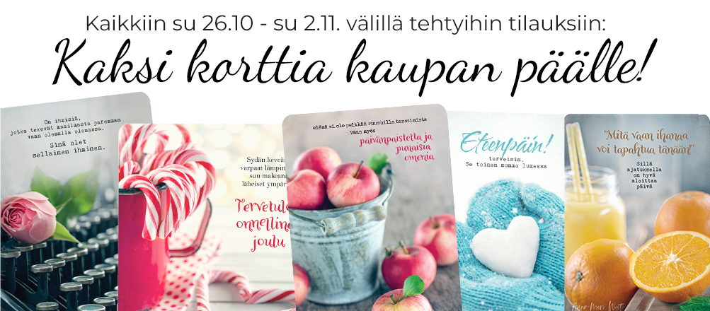Kun teet tilauksen verkkokaupassa su 26.10. – su 2.11. välisenä aikana, lisää automaattisesti tilaukseen mukaan kaksi ylimääräistä korttia! HUOM tilausten postitus ma-ti 3.-4.11., eli viikolla 44 ei ole tilausten postituksia. Ylimääräiset kortit ovat satunnaisesti valittuja, mutta voit lisätä kassalla tilauksen kommentteihin toiveen korteista (esimerkiksi joulukortti, ei-jouluaihe, onnittelu jne). Tarjous alkaa sunnuntaina 26.10. klo 18.00.