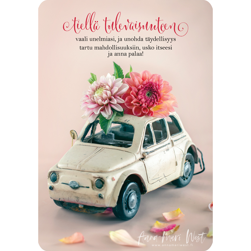 Avattava 2-osainen kortti, jonka kulmat on pyöristetty. Sisäsivulla teksti ”Onnea matkaan!”. Hintaan kuuluu kirjekuori. Kortin materiaali on mattakartonki, ja koko on 11,2 x 16,4 cm. Vesileimaa / logoa ei ole painetussa kortissa.
