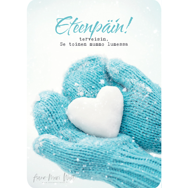 Meitä mummoja on lumessa paljon. Ja suunta on aina eteenpäin! Inspiroiva kortti mummoystävällesi.
